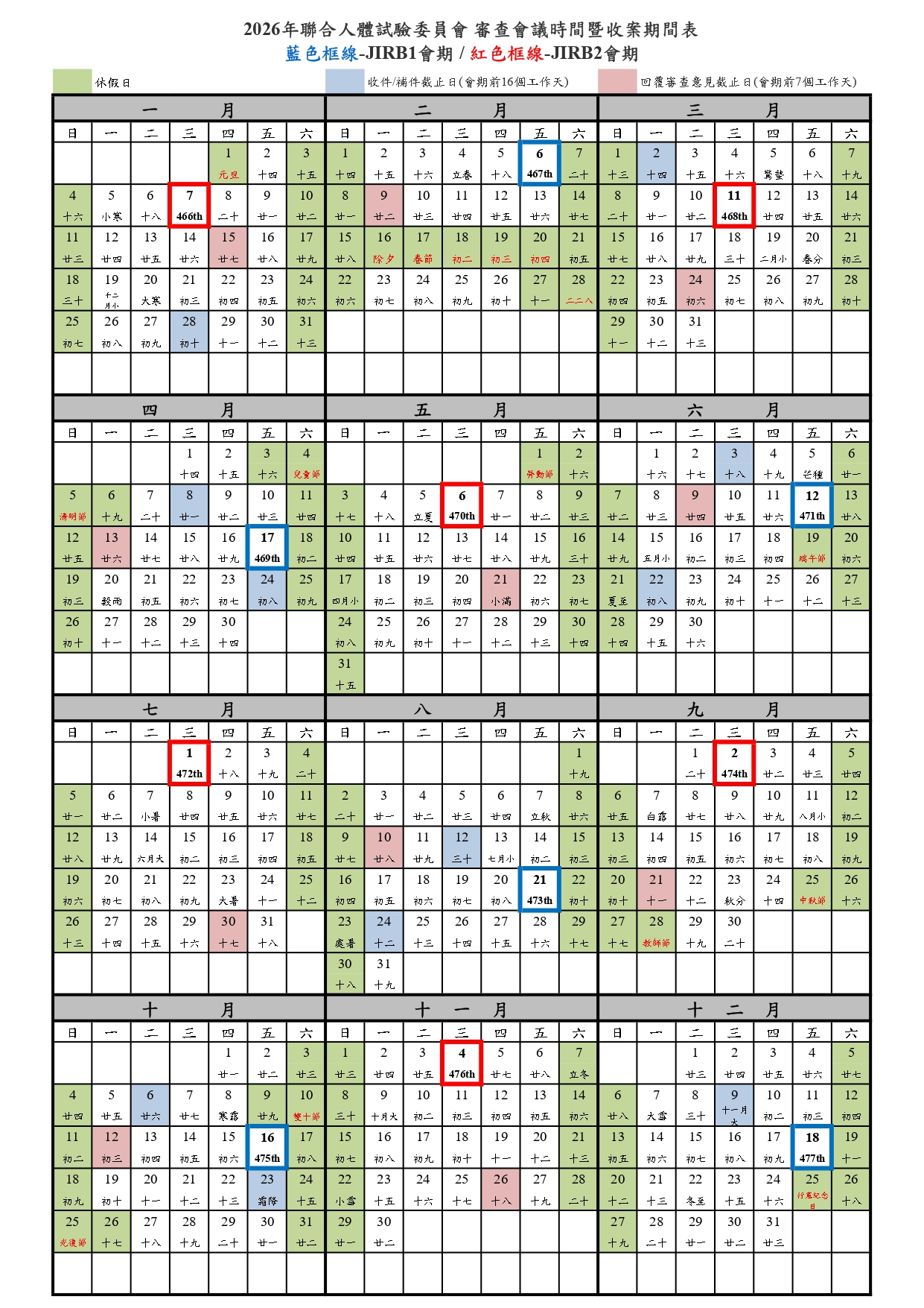 2026年 - 聯合人體試驗委員會審查會議時間暨收案期間表
