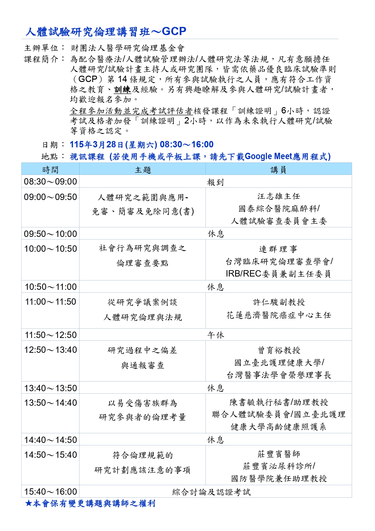 - 請先與欲送審之IRB機構確認,本課程訓練時數可否予以採認。