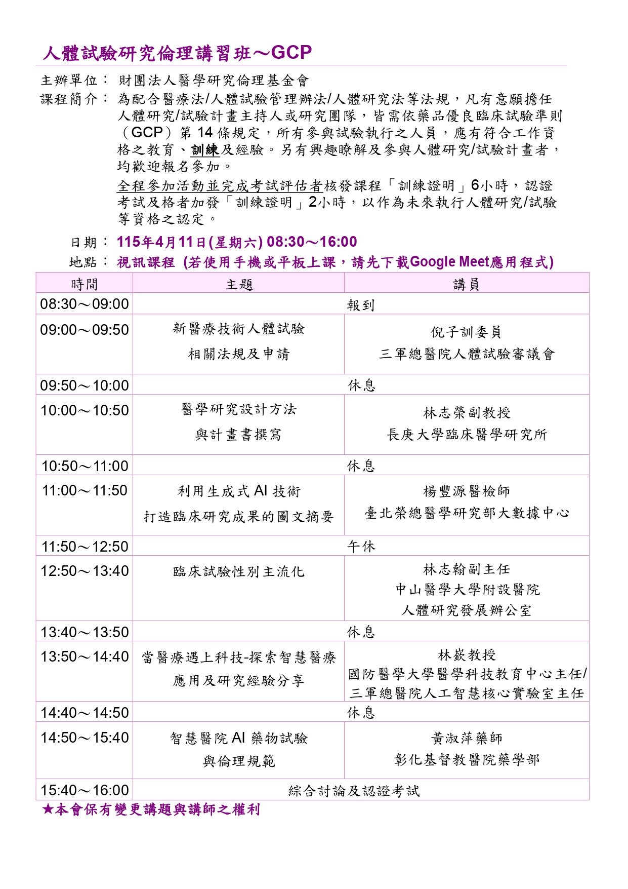 115/04/11 人體試驗研究倫理講習班~GCP(課程已結束)